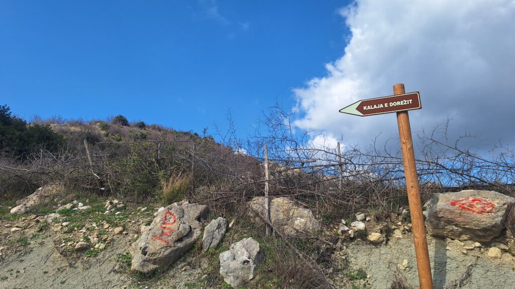 After about 2.4 kilometers along the valley, the route reaches Qafa e Dorëzit, above the village of the same name. From there, the castle walls can be reached by walking approximately 600 meters northwest.